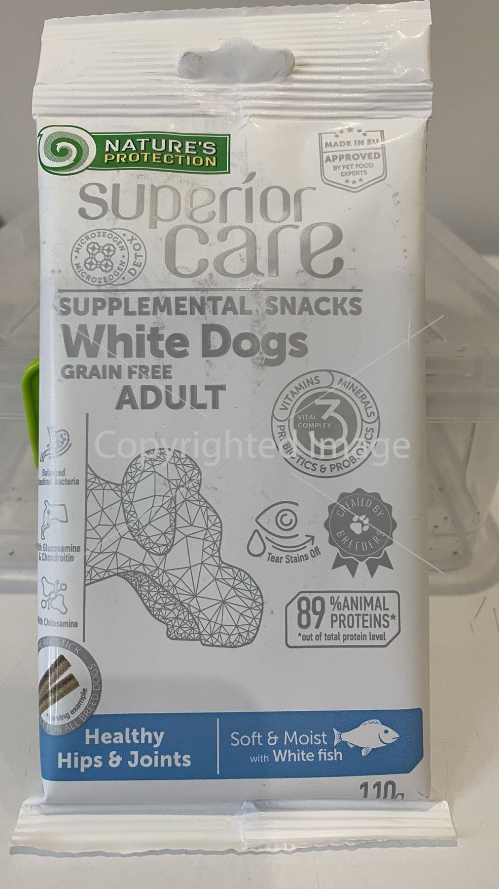 Беззернові ласощі Nature's Protection Superior Care White Dogs Healthy Hips & Joints з білою рибою — підтримка суглобів, здоров’я шерсті та імунітету. Купити в зоомагазині «Лапохвостики».